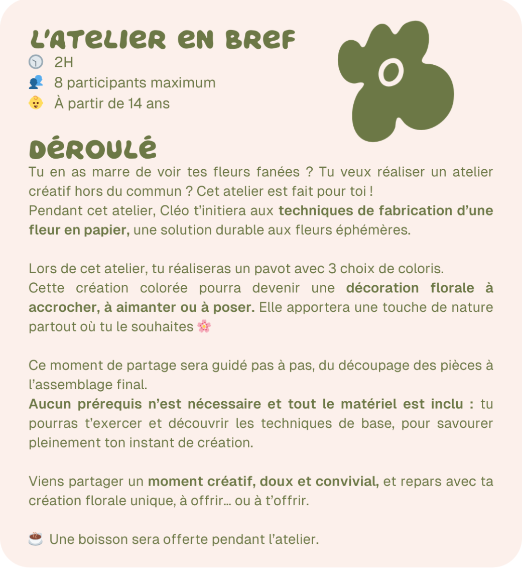 2026-03-14 10:30:002026-03-14 12:30:00Europe/ParisATELIER FLEUR EN PAPIERReservations on : https://www.billetweb.fr/atelier-fleur-en-papier1