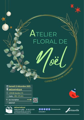 2025-12-13 15:30:00 2025-12-13 17:30:00 Europe/Paris Atelier Floral Reservations on : https://www.boucledesmediatheques.fr/Sartrouville -- Venez confectionner une couronne pour les fêtes !   Corinne, fleuriste, vous guidera dans sa réalisation. Présentation de l’art floral : Un moment de détente et d’évasion Le travail des plantes de saison La FIERTE de faire soi-même et de rapporter sa création à la maison Le partage de sa sensibilité à la beauté de la nature La passion des plantes Un pur moment de PLAISIR Réservé à un public à partir de 14 ans Gratuit sur inscription Médiathèque de Sartrouville, Place des Fusillés, Sartrouville, France Médiathèque de Sartrouville