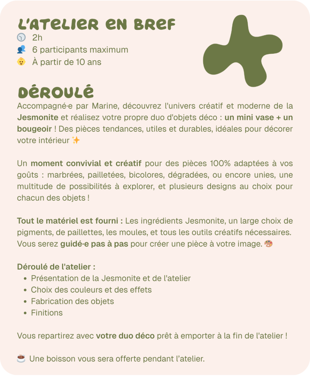 Viens passer un moment créatif et convivial au Tadam Café pour apprendre à réaliser un mini vase et un bougeoir en Jesmonite : une technique tendance mêlant couleurs et matières pour créer un objet déco unique à emporter chez toi !
