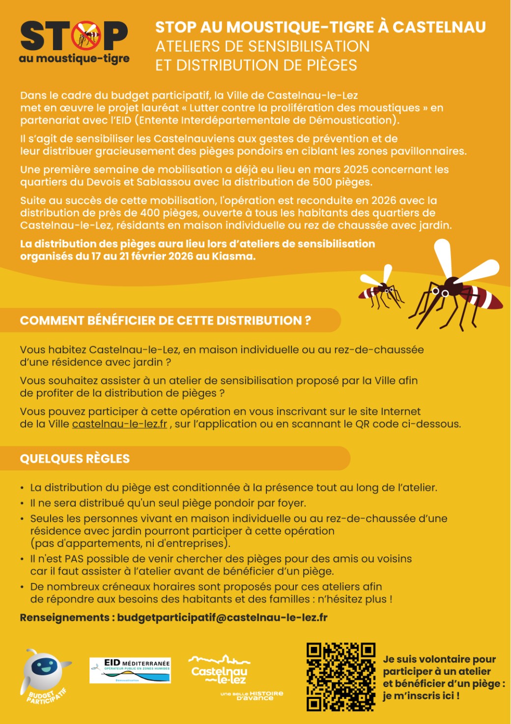 Il s’agit de sensibiliser les Castelnauviens aux gestes de prévention via des ateliers pratiques et ludiques animés par l'EID, au cours desquels chaque foyer participant reçoit un piège pondoir à disposer à son domicile.
