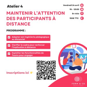 2026-04-24 09:00:002026-04-24 12:30:00Europe/ParisAtelier - Maintenir l’attention des participants à distanceReservations on : https://www.billetweb.fr/atelier-maintenir-l-attention-des-participants-a-distance