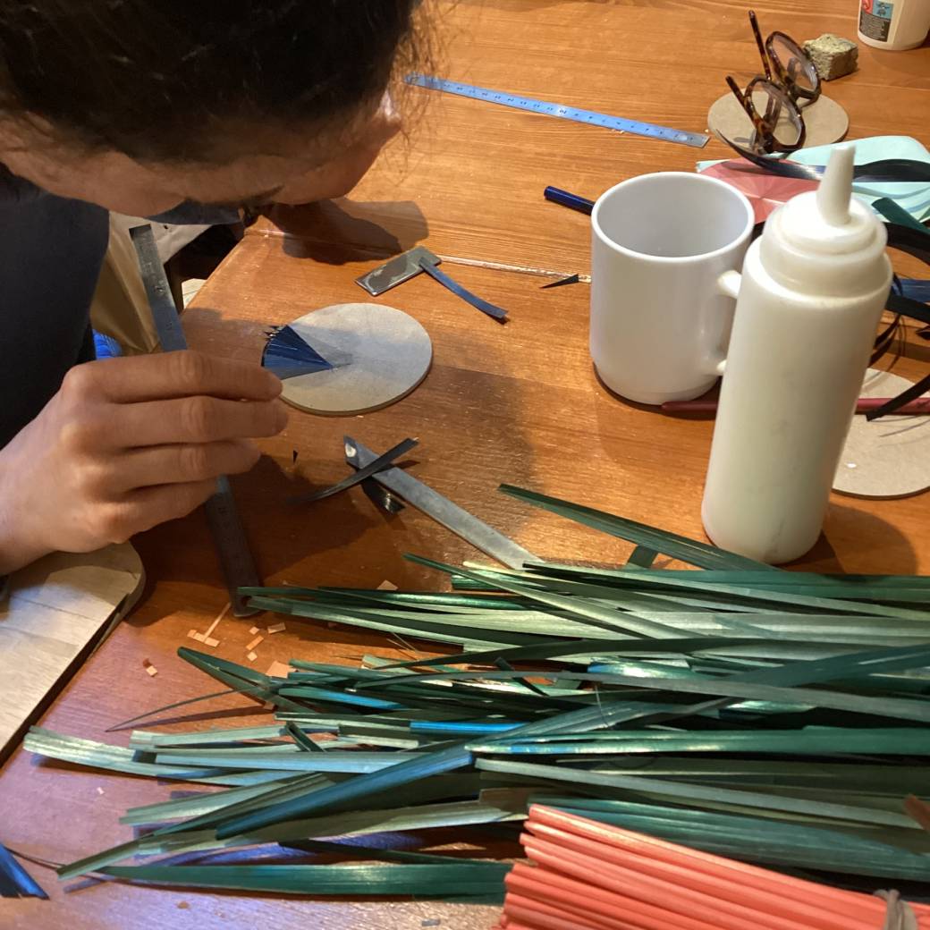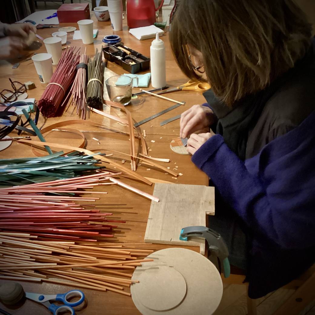 Il consiste à coller, écraser des brins de paille sur un support, en variant leurs inclinaisons pour créer des contrastes et des jeux de lumières.