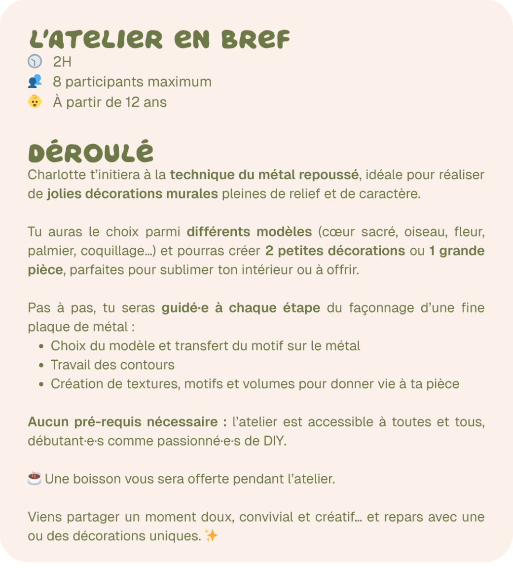 2026-02-20 18:30:002026-04-25 14:00:00Europe/ParisATELIER METAL À REPOUSSÉ : viens faire ta décoReservations on : https://www.billetweb.fr/atelier-metal-a-repousser