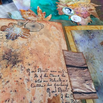 Nous travaillerons avec de la pâte de structure, des Brushos, des encres et/ou de l'aquarelle pour fabriquer des papiers “faits maison” qui constitueront les pages de l'album.