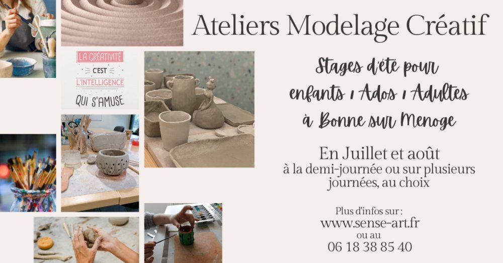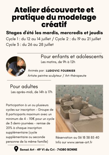 2022-07-12 09:00:00 2022-08-11 17:00:00 Europe/Paris Atelier découverte et pratique du modelage créatif Reservations on : https://www.billetweb.fr/atelier-modelage-creatif -- 49 Chemin Communal VI du Cri, Bonne, France SenséArt
