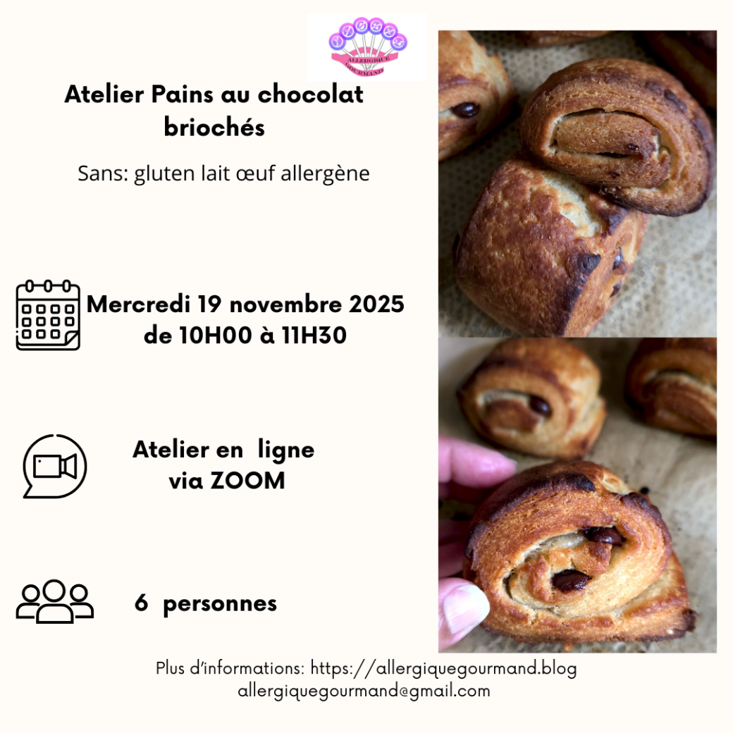 2025-11-19 10:00:00 2025-11-19 11:30:00 Europe/Paris Atelier pains au chocolat briochés Reservations on : https://allergiquegourmand.blog/ -- Vous rêvez tous de pains au chocolat sans gluten, sans lait, sans oeuf, sans allergène. Je vous propose de passer 1H30 à réaliser des pains au chocolat briochés. Ils seront parfaits pour le petit-déjeuner dominical.  En plus de cette recette vous apprendrez aussi à réaliser un beurre végétal permettant la réalisation d'une pâte levée feuilletée. Ce qui a son importance.    Comment se déroule l'atelier? Après inscription, vous recevrez la liste des ingrédients et le lien ZOOM pour y assister. Suite à celui-ci, j'envoie le replay, la recette,  fiche CONSEILS ainsi que le lien pour accéder au groupe SUIVI des ateliers.  Suivi essentiel afin de corriger ou adpater la recette en fonction de vos ingrédients et de votre four.    Au cours de l'atelier, je réponds à toutes les questions et explique plus en profondeur les caractéristiques des farines, temps de pousses etc. IMPORTANT: toutes les recettes sont confectionnées avec un mix maison.    Si vous avez des questions, surtout n'hésitez pas… - Marie LOSSY EI