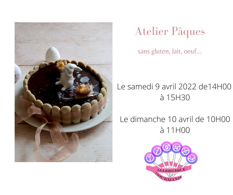 - le samedi 9 avril de 14H00 à 15H30 pendant lequel on réalisera boudoirs, crème etc, sans gluten, lait, oeuf, allergène.
