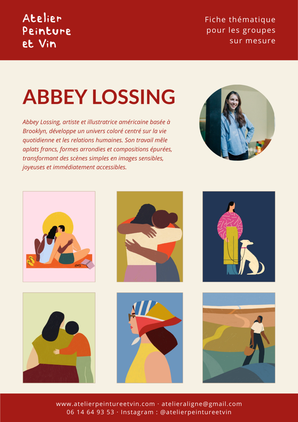 Découvrez la peinture lors d'un atelier créatif et accessible, où vous réaliserez votre propre œuvre en vous inspirant d'un thème artistique et d'un·e artiste ! Ici, Abbey Lossing sera à l’honneur, avec son univers coloré centré sur les relations humaines et la vie quotidienne.