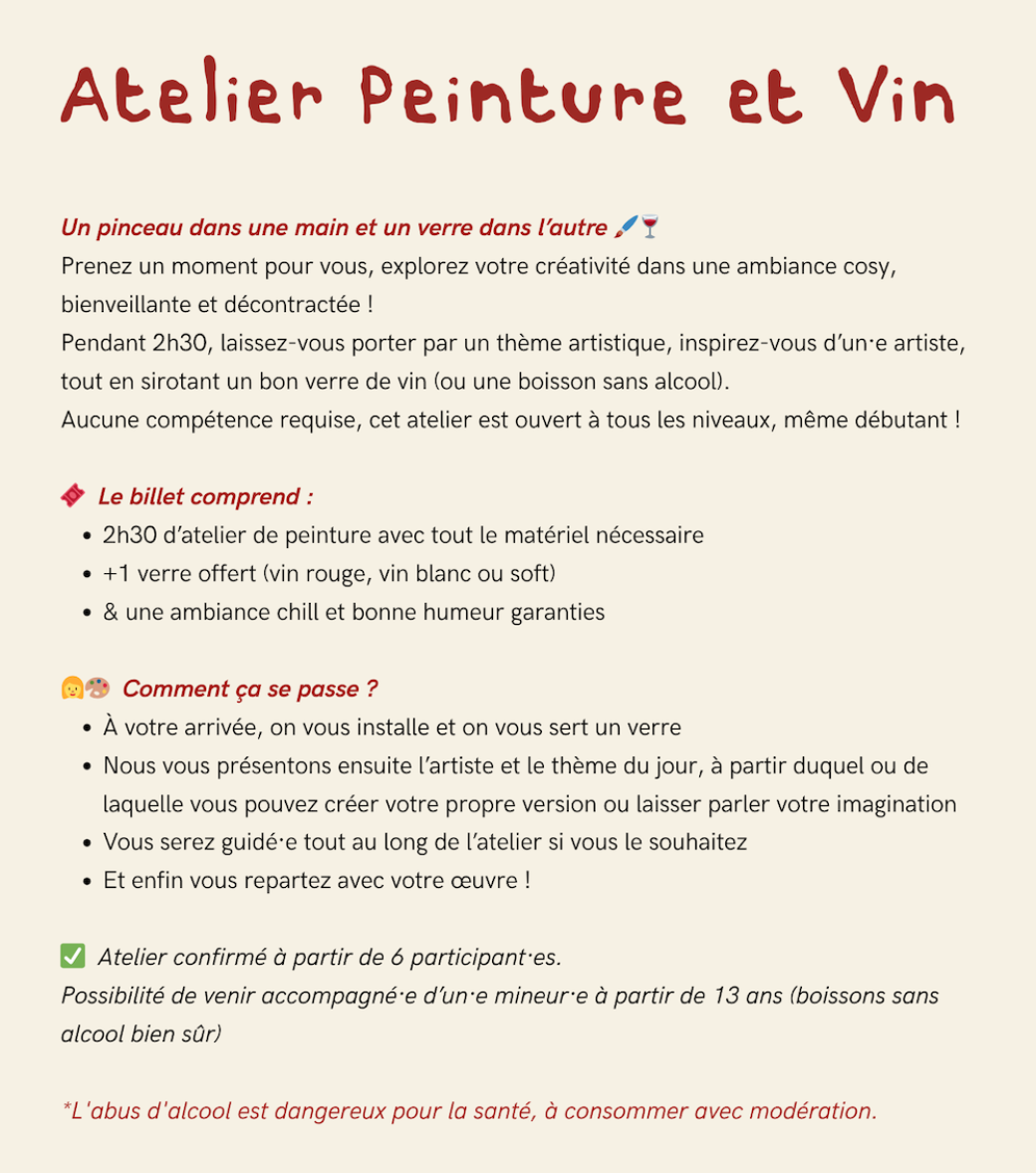 2026-05-27 19:30:00 2026-05-27 22:00:00 Europe/Paris Atelier Peinture & Vin · Aux 4 Coins du Vin Bordeaux · Mercredi 27 Mai 2026 · 19h30-22h Reservations on : http://www.atelierpeintureetvin.com -- Aux Quatre Coins du Vin, Rue de la Devise, Bordeaux, France Atelier Peinture et Vin