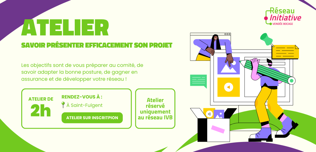 2026-06-08 14:00:00 2026-06-08 16:00:00 Europe/Paris Atelier Porteurs : Savoir présenter efficacement son projet Reservations on : https://www.billetweb.fr/atelier-porteurs-savoir-presenter-efficacement-son-projet5 -- Vous êtes un.e porteur.euse de projet et vous passez bientôt en comité d'agrément Initiative ? Cet atelier est pour vous !  L'objectif de cette réunion est de vous y préparer au mieux, en vous donnant toutes les informations à connaître sur l'organisation, ainsi que nos conseils pour pitcher votre projet et avoir la bonne posture. 2 Rue Jules Verne, Saint-Fulgent, France Réseau Initiative Vendée Bocage