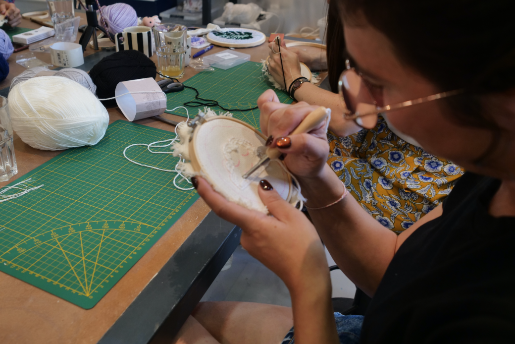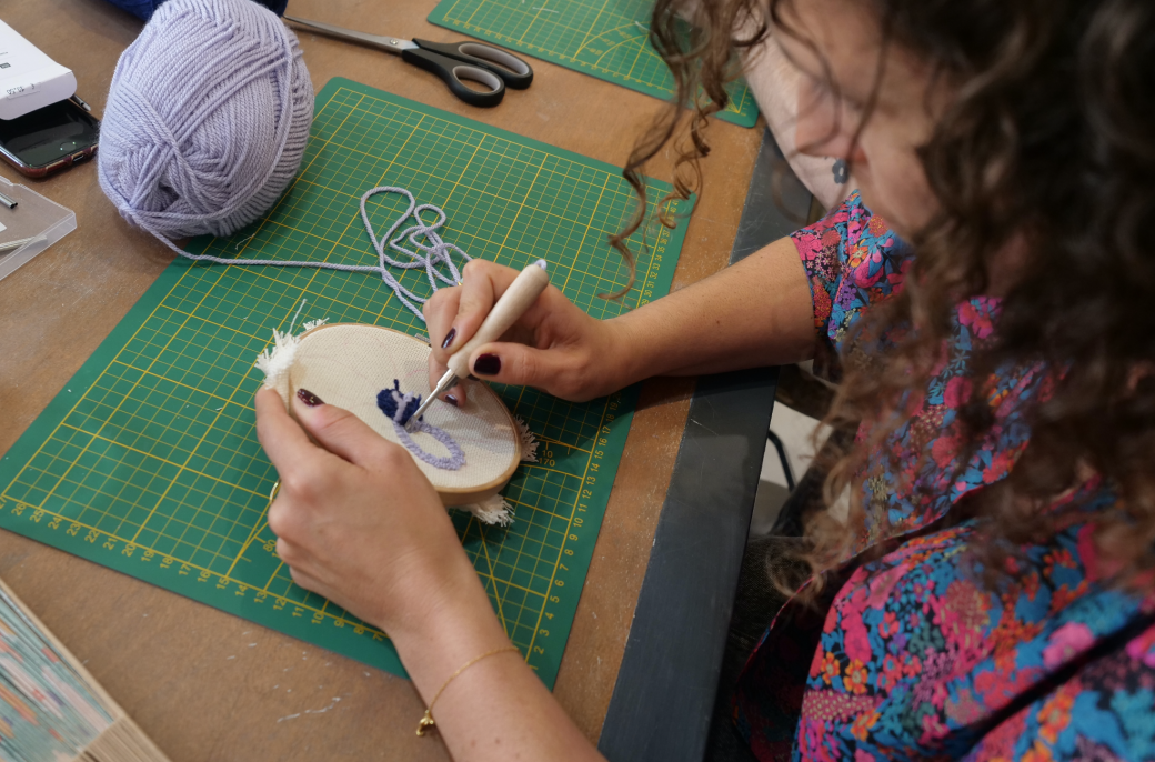 Le punch needle, c’est une technique textile à la fois simple et douce : on utilise une aiguille spéciale pour faire glisser de la laine à travers une toile de manière répétée, jusqu’à former des boucles moelleuses qui deviennent une vraie création en relief. C’est presque comme dessiner avec de la laine — un geste intuitif qui donne rapidement du résultat, même aux débutant·es.