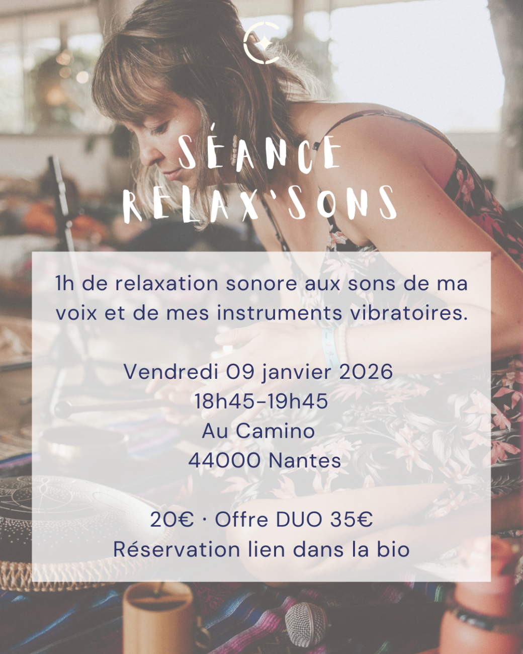 Rendez-vous le vendredi 09 janvier 2026 de 18h45 à 19h45 dans la magnifique salle du Camino à Nantes et embarque pour un voyage sonore unique grâce à la musicalité vibratoire et les énergies de l'instant !
