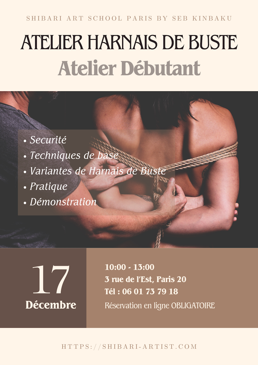 * Une Démonstration/Performance : Découvrez le kinbaku en action, en utilisant les techniques enseignées au cours.