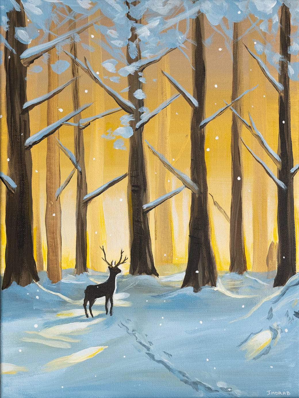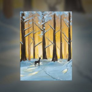 Dans cet atelier, on joue avec les contrastes du blanc, du bleu et du brun pour faire apparaître la silhouette majestueuse d’un cerf sous les flocons.