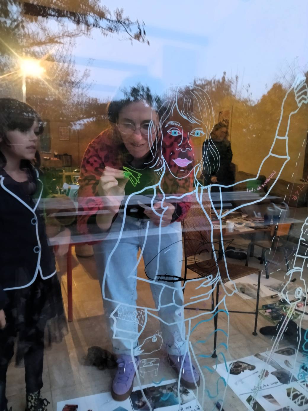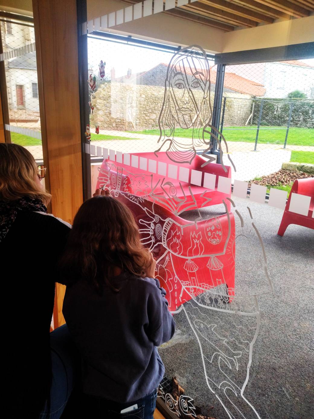 Amandine Sourisseau dessinera sur chaque pan de vitrine dédié le visage de l'enfant et le corps de l'adulte en posture de super-héros que chaque participant viendra personnaliser d' écusson, signature, symboles, motifs propre à son personnage.