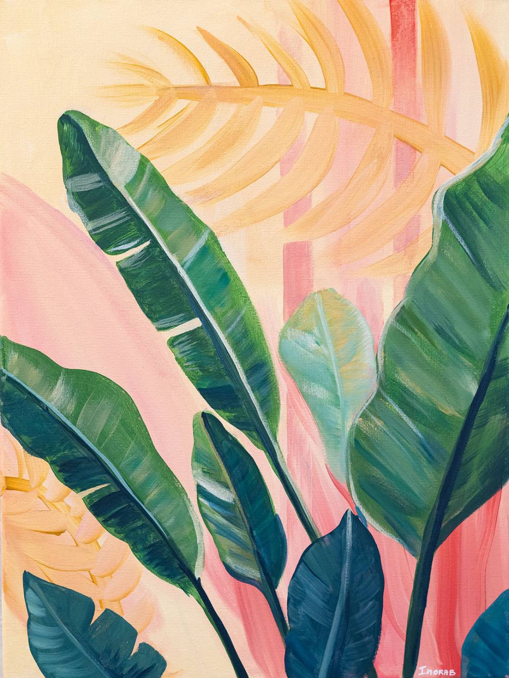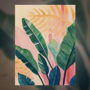 Laisse-toi embarquer sous les tropiques avec cette toile aux feuilles de bananier et aux couleurs chaleureuses.
