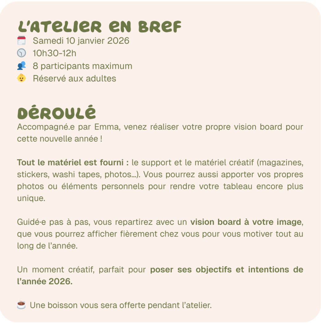 Vous cherchez une activité créative et motivante pour bien démarrer 2026 ? Vous êtes au bon endroit ! Venez créer votre vision board, ce tableau de visualisation qui concrétise vos projets de l’année sous un format créatif et visuel.