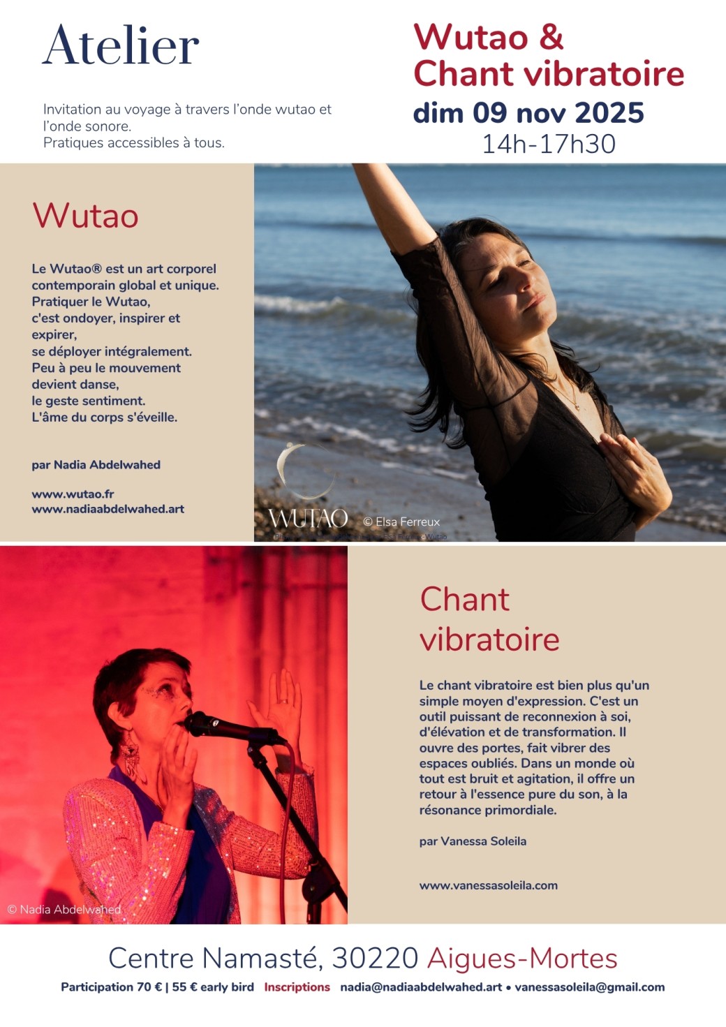Pratiquer le wutao c’est ondoyer, inspirer et expirer, se déployer intégralement depuis son centre. Une invitation à se laisser traverser, une rencontre intime avec soi. Peu à peu le mouvement devient danse, le souffle cadence, le langage du corps s'éveille. Bienvenue dans ce champ de liberté à travers les éveils de l’onde, mouvements calligraphiés et Chant du Souffle. Le wutao est une pratique accessible à tous dont l'intention est de se laisser toucher par une autre présence au corps.