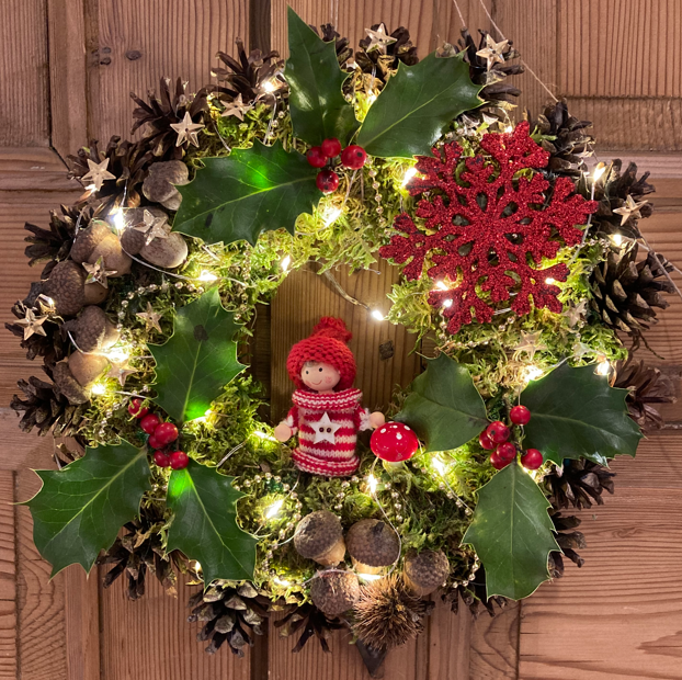 Couronnes de Noël : vous serez guidés dans l'élaboration d'une couronne de Noël à suspendre en intérieur ou en extérieur. Couronne à réaliser en solo. Pour adulte et ado.