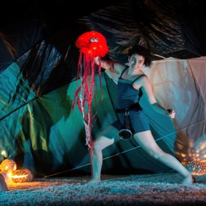 Dans les eaux profondes, deux étranges plongeuses partent en exploration et font la rencontre d’une drôle de créature qui n’a pas de forme définie. Elle va se transformer, se métamorphoser et prendre différentes apparences, grandir jusqu’à ce qu’elle soit prête à sortir de sa coquille. La poésie du spectacle invite les plus grands à imaginer un parallèle entre le monde aquatique et celui du monde intra- utérin. Les tout-petits, eux,« plongent » en confiance dans ce cocon de douceur.