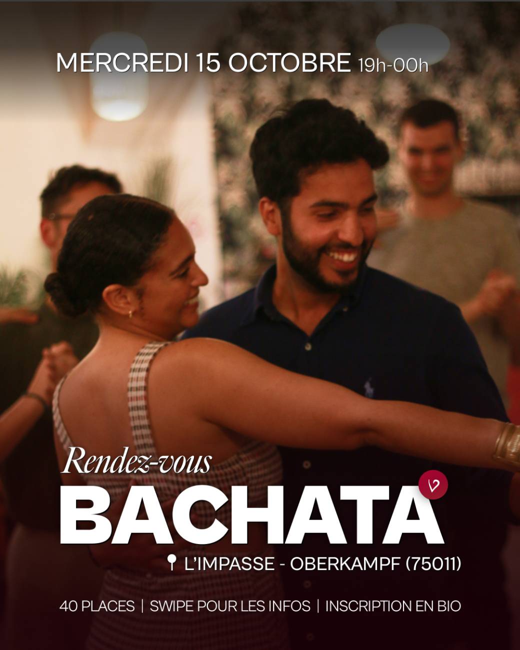 2025-10-15 19:00:002025-10-15 23:55:00Europe/ParisSOIRÉE BACHATAReservations on : https://www.billetweb.fr/bachata4