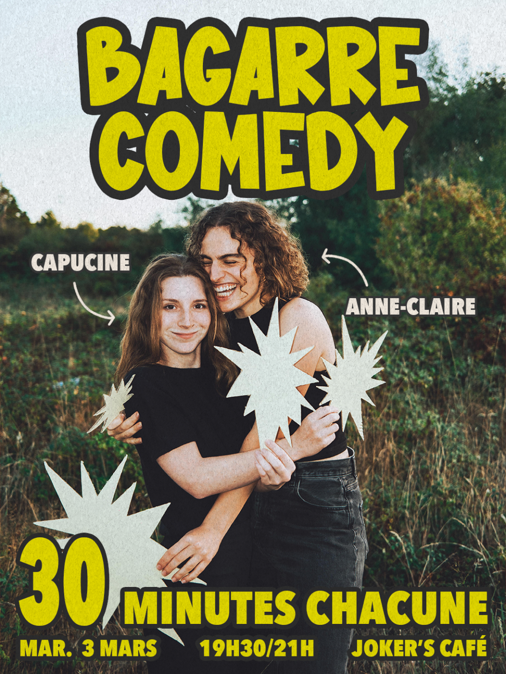 Bagarre Comedy revient au Joker's Café pour une soirée stand-up dans un format spécial ! Les deux mamans du plateau, Anne-Claire Chapa et Capucine Brébion, feront 30 minutes de blagues chacune, pour 1h de spectacle !
