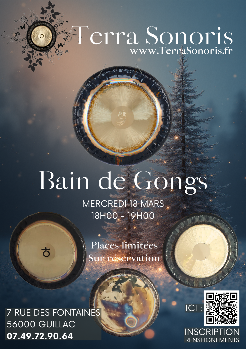 2026-03-18 18:00:00 2026-03-18 19:00:00 Europe/Paris Bain de GONGS Reservations on : https://www.billetweb.fr/bain-de-gongs5 -- Grand bain de Gongs Durée de la séance 1H00   Prévoir : - Un tapis de Yoga épais (ou 2 tapis fin, objectif : confort !!) - Une tenue confortable - Une couverture et un petit coussin pour la tête - Une bouteille d'eau    Visitez notre site : www.TerraSonoris.fr 7 Rue des Fontaines, 56800 Guillac, France Terra Sonoris