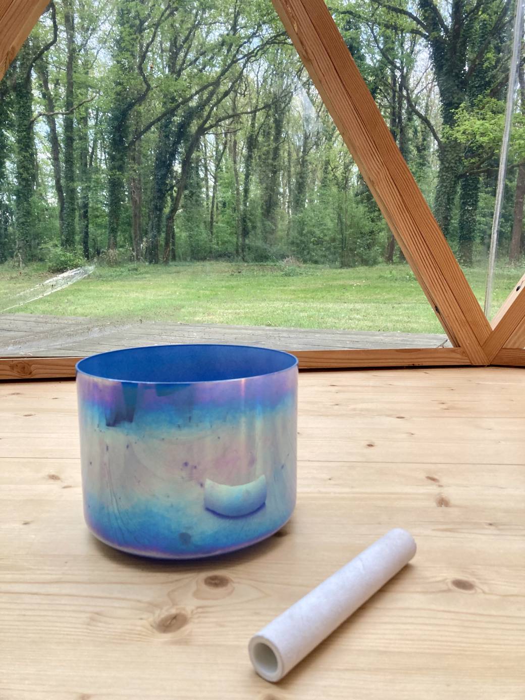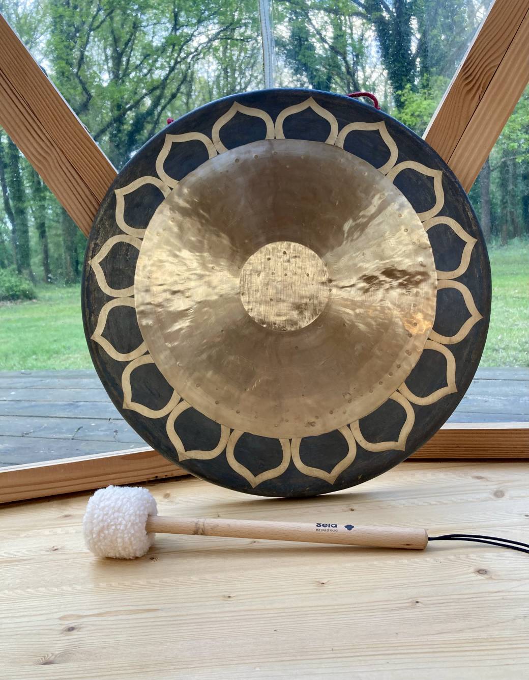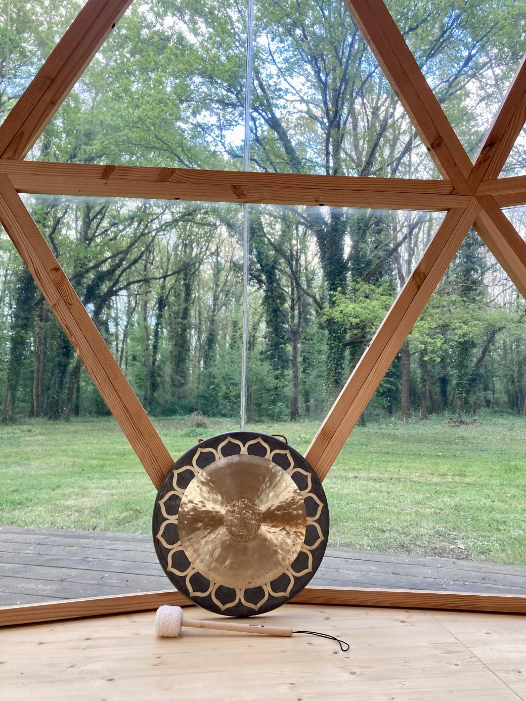 La séance est accompagnée d’instruments variés : gong, bols en cristal et tibétains, carillons, tambour de l’océan, bâton de pluie et autres instruments intuitifs, créant un univers sonore riche et enveloppant.