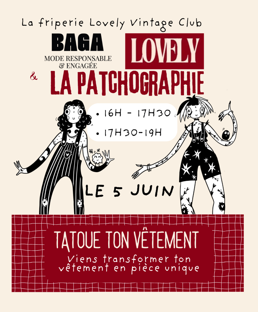 2026-06-05 16:00:002026-06-05 19:00:00Europe/ParisTatoue ton vêtement - Baga - La Patchographie - Lovely Vintage ClubReservations on : https://www.billetweb.fr/bandit-fleurit-baga-la-patchographie-atelier-random1