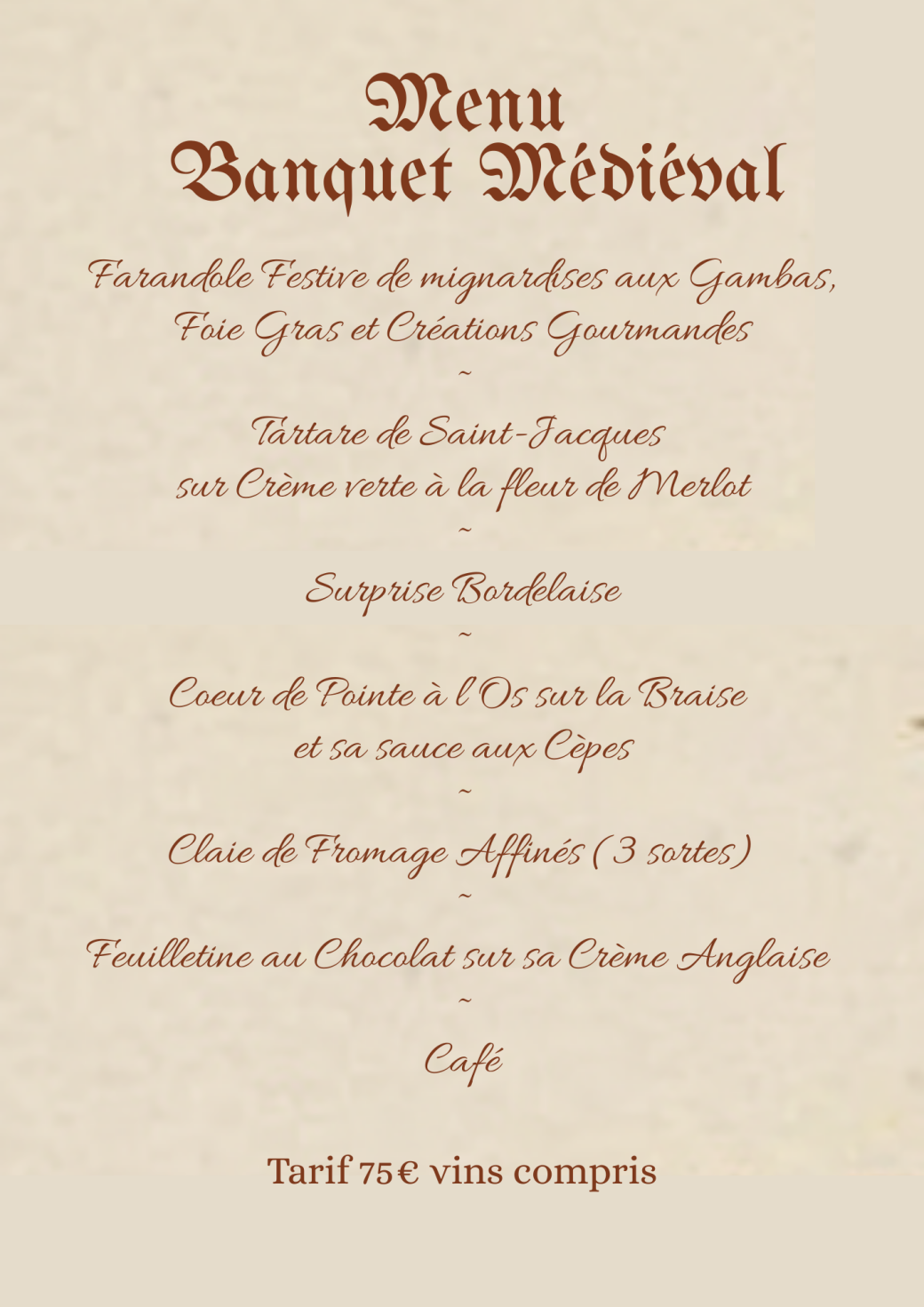 À la dix-neuvième heure, l’on servira l’apéritif, prélude au grand banquet festif où mets savoureux et vins généreux de nos domaines seront offerts à tous les convives.