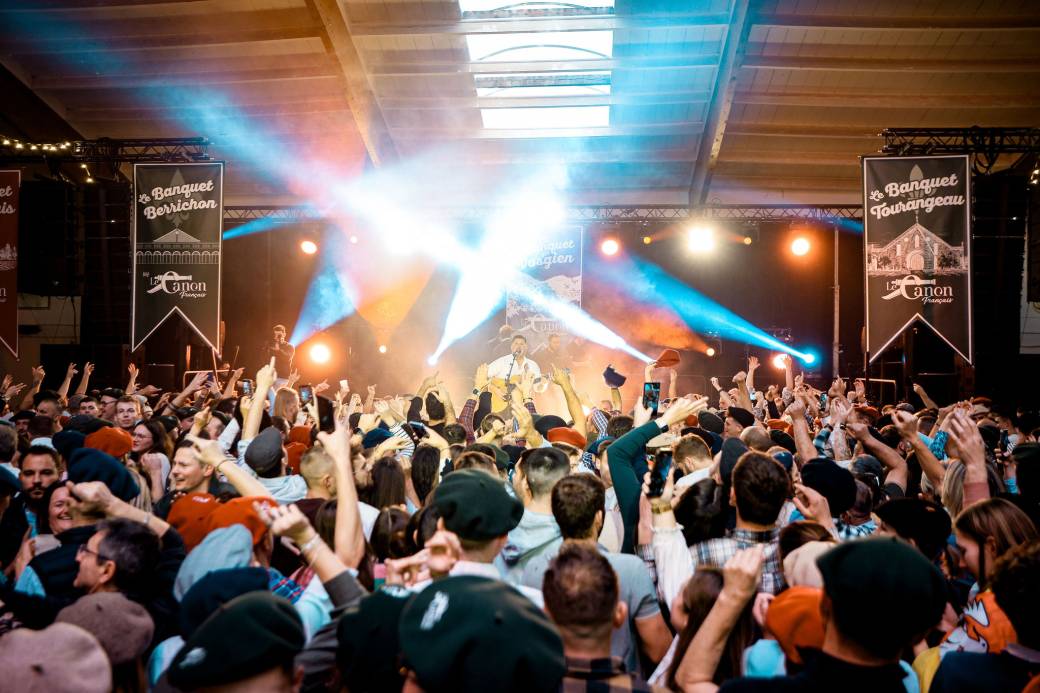 Toutes les tables seront disposées de manière à former de grandes tablées continues, afin que nous soyons tous ensemble pour partager ce moment festif. Cependant, afin d'assurer un service fluide et efficace, les repas et le vin seront servis par tranche de 8 personnes.