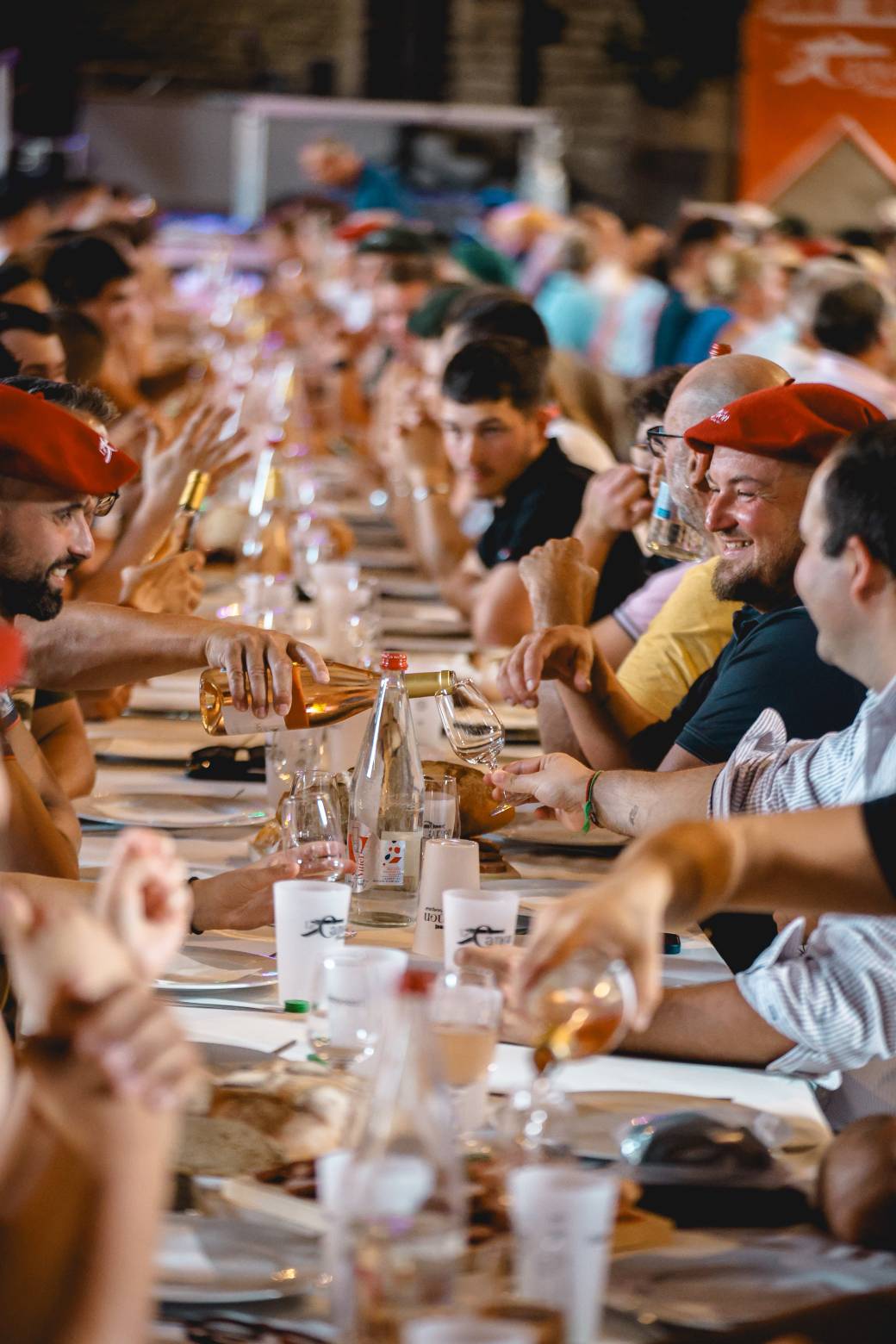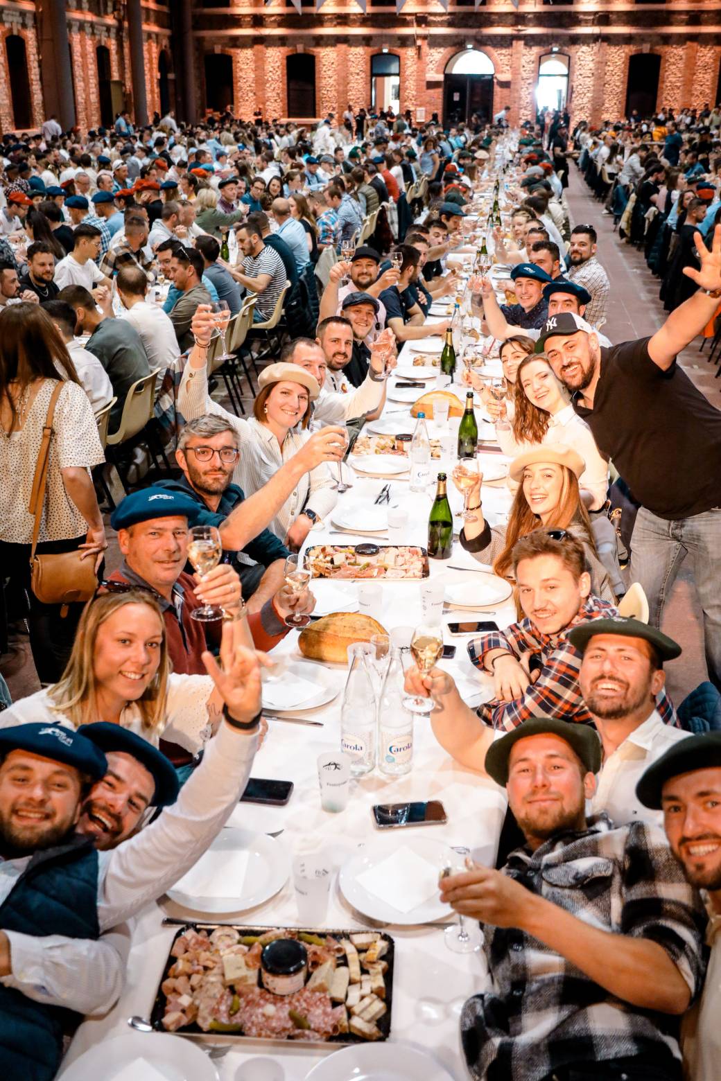 Toutes les tables seront disposées de manière à former de grandes tablées continues, afin que nous soyons tous ensemble pour partager ce moment festif. Cependant, afin d'assurer un service fluide et efficace, les repas et le vin seront servis par tranche de 8 personnes.