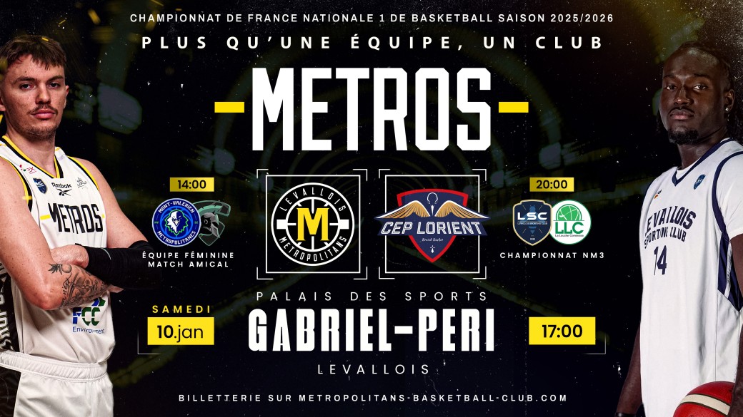2026-01-10 17:00:002026-01-10 19:00:00Europe/ParisBASKETBALL NM1 - LEVALLOIS METROPOLITANS BC vs LORIENTReservations on : https://www.billetweb.fr/basketball-nm1-levallois-metropolitans-bc-vs-lorient