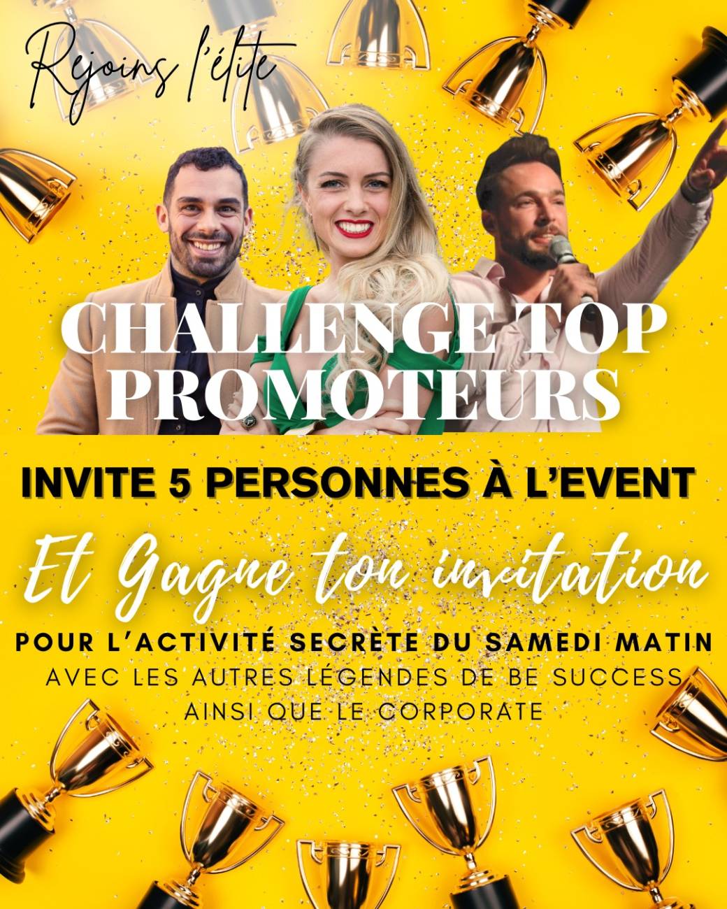 Invite 5 personnes (non membres) à booker leur place pour l'événement -> envoie les 5 captures écran d'un coup dans la Communauté -> on vérifie -> et après validation tu rejoins les Top Promoteurs BE SUCCESS = Vous Gagnez votre invitation pour l'activité super fun et secrète du Samedi Matin avec les autres légendes Top Promoteurs de BE SUCCESS et tous les membres du Corporate. L'activité et l'adresse vous sera envoyée la veille.