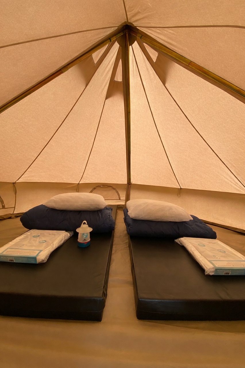 Ils proposent un espace élégant et spacieux sous toile, un matelas confortable (en mousse de 10 cm d'épaisseur) par personne et une lampe.