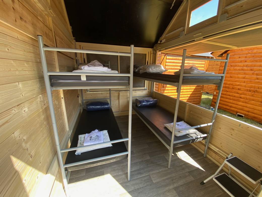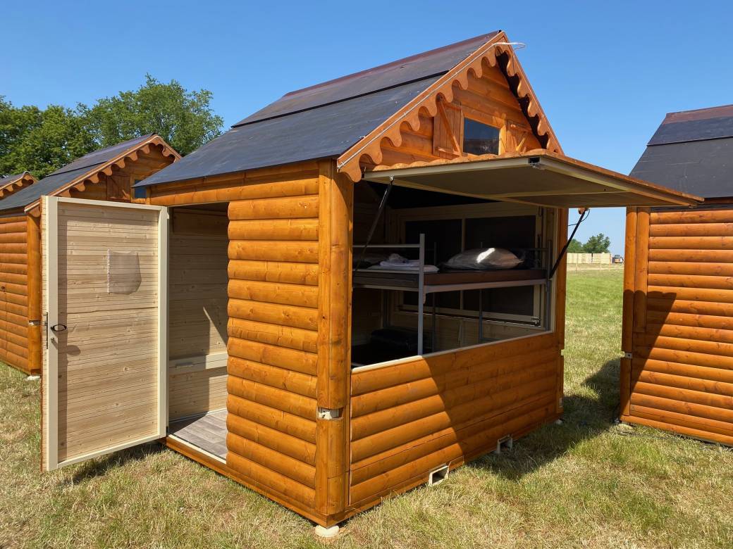 - La CABANE : elle offre un accès à un chalet en bois robuste et cosy de 7m2, équipé de prises électriques, d'éclairage intérieur et extérieur et de 2 lits superposés (cabane 4 pers.) ou 2 lits simples (cabane 2 pers.) avec matelas.