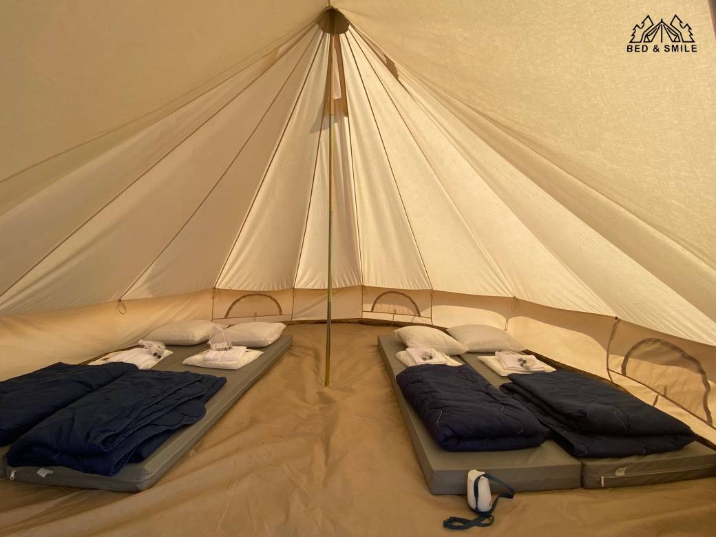 ils proposent un espace élégant et spacieux sous toile, un matelas confortable (en mousse de 10 cm d'épaisseur) par personne et une lampe.