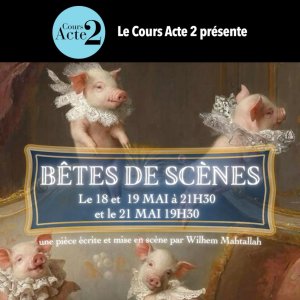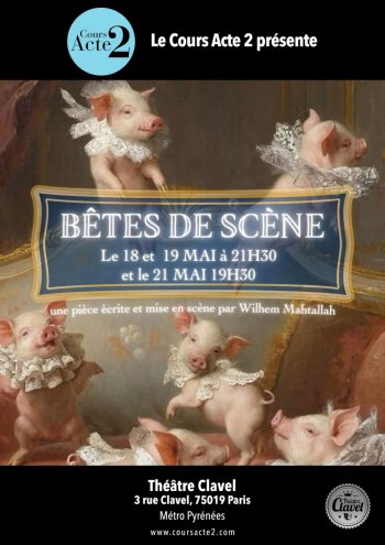 2026-05-18 21:30:00 2026-05-21 19:30:00 Europe/Paris Bêtes de Scène Reservations on : https://www.billetweb.fr/betes-de-scene2 -- Mise en scène de Wilhem Mahtallah Texte de Wilhem Mahtallah   La pièce : Une comédie grinçante et jouissive sur les coulisses du monde du théâtre. Une metteuse en scène dépassée, des comédien.ne.s névrosé.e.s, une scénographe allumée, des assistantes malmenées, une productrice endettée. Des répétitions jusqu’au jour fatidique de la première: vous saurez tout sur les secrets du théâtre. (Une comédie inspirée de faits réels)    Avec : Roman Begat, Mathilde Bernaert, Ariane Boyer, Arthur Brizard, Melaine Bustos, Barbara Crvelin, Farah Krideche, Valentine Mangili, Nolwenn Mante, Marion Prat, Frédérique Sarfati Romano, Tom Senterre, Caroline Verger-Giambelluc   ---   Cours Acte 2 Cours de théâtre pour adultes amateurs à Paris.  On apprend mieux en s’amusant ! Théâtre Clavel, Rue Clavel, Paris, France Cours Acte 2