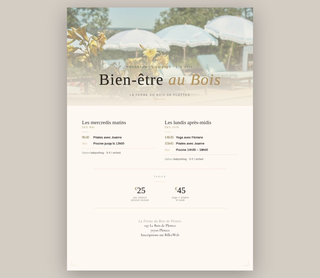 Une heure de yoga pour souffler, recentrer et prendre soin de soi — dans le cadre verdoyant de La Ferme du Bois de Plottes. Cours en plein air ou en intérieur selon la météo, suivi d'un accès piscine libre.