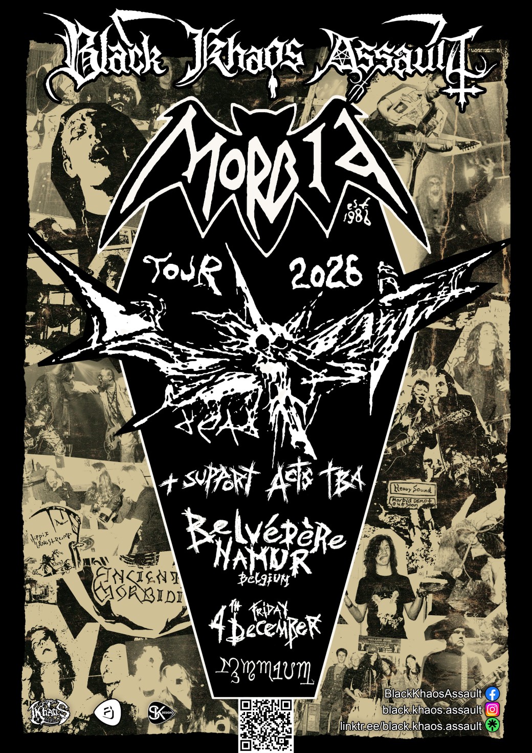 Reservations on : https://www.billetweb.fr/bka-04-12-2026-morbid -- A MORBID EVENING OVER BELGIUM ... Black Khaos Assault - akt 60 - The Morbid akt ! Event presented by : Black Khaos Assault https://www.facebook.com/BlackKhaosAssault In conspiracy with: BELVEDERE Namur https://www.facebook.com/BELVEDEREnamur Annaconda Booking https://www.facebook.com/AnnaCondaBookingManagement ███████████████████████████████████████ Line-up & Timetable : 19:00 - 19:30 : guest TBA (TBA - TBA) TBA 20:00 - 20:30 : guest TBA (TBA - TBA) TBA 21:10 - 22:00 : guest TBA (TBA - TBA ) TBA 22:45 - 23:45 : MORBID (60') (Dark Metal - Stockholm) SWE Doors at 18.30 / Start at 19.00 / Curfew 01.00