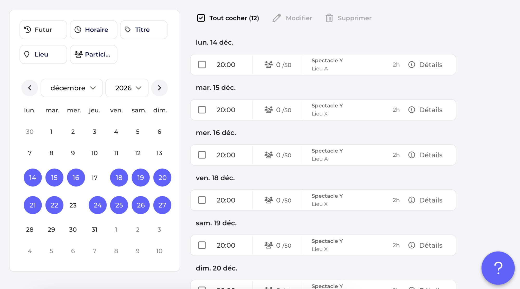 Lors d’une tournée, les lieux peuvent également varier. Vous pouvez préciser ce point pour chacune des séances (et y ajouter une description également). Ces informations seront visibles au moment de l’achat.