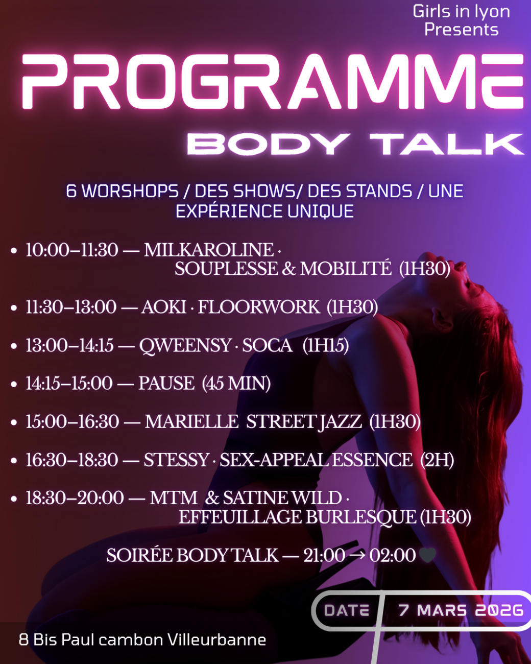 Si tu as envie de vivre une journée/soirée où tu te sens enfin à ta place, entourée d’autres filles comme toi… Body Talk est fait pour toi.