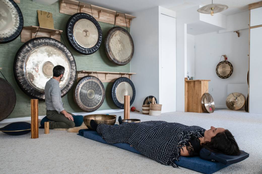 Allongé confortablement, face à un mur de gongs, la personne est enveloppée par une architecture sonore puissante et subtile à la fois.