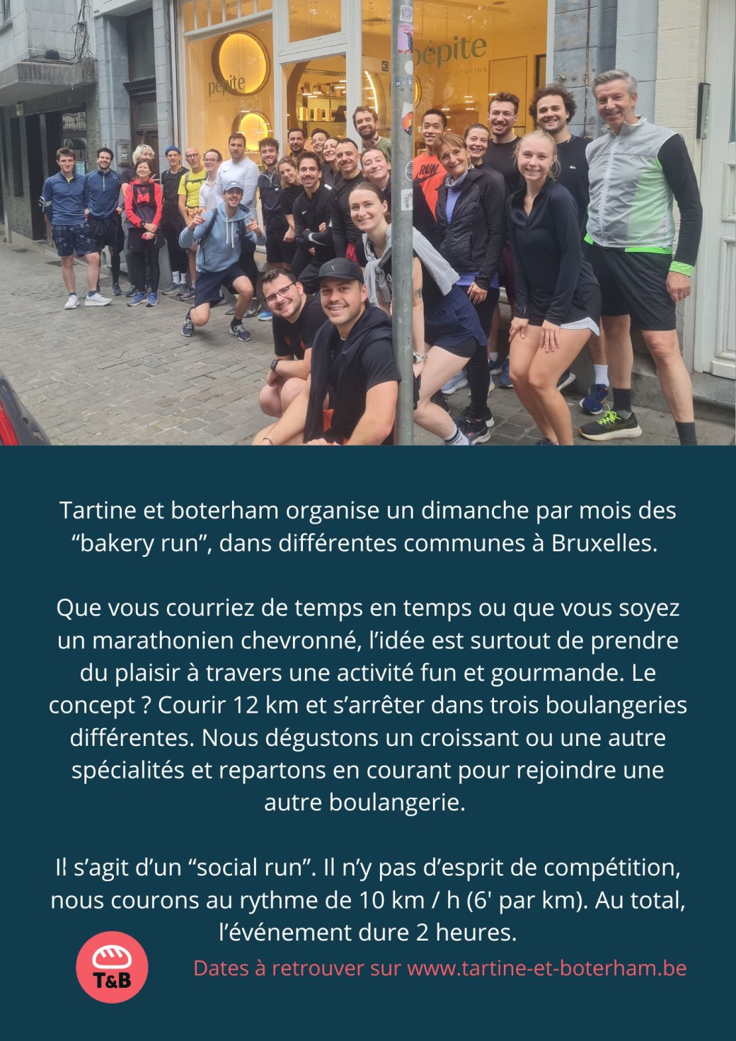 Courir, manger, courir, manger, courir, manger… c’est le menu de notre bakery run ! Pour ceux qui nous connaissent, nous sommes « Tartine et boterham », une association qui organise des événements autour des boulangeries et pâtisseries : www.tartine-et-boterham.be