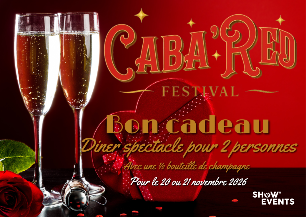 Ce bon cadeau comprends 2 places pour un soir au choix du Caba'Red Festival (repas, spectacle, une coupe de soupe de champage et 1/2 bouteille de champagne)