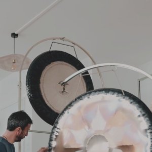 Allongé confortablement sur un futon, le corps est enveloppé par les vibrations de deux gongs positionnés à la tête et aux pieds, accompagnés de quelques instruments thérapeutiques.