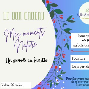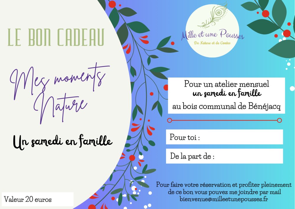 Le bon de 20€ est valable sur les ateliers mensuel "Un samedi en famille " de 10h à 12h au bois communal de Bénéjacq.