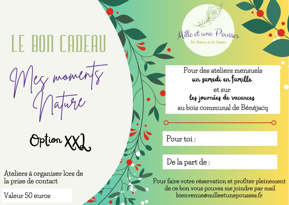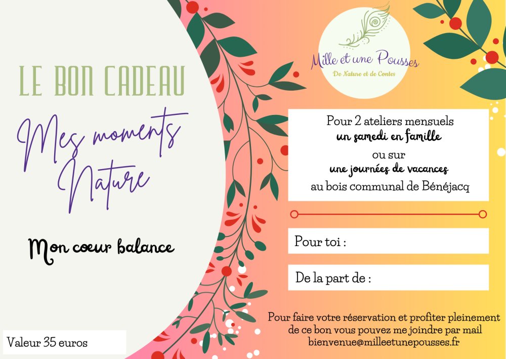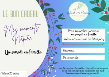 2024-12-05 00:00:00 2025-12-31 00:00:00 Europe/Paris Bons cadeaux nature " Mes moments nature" Reservations on : https://www.billetweb.fr/bon-cadeau-milleetunepousses -- Le bon de 20€ est valable sur les ateliers mensuel "Un samedi en famille " de 10h à 12h au bois communal de Bénéjacq. Les bons de 35€ et 50€ sont valables sur les ateliers mensuel "Un samedi en famille" de 10h à 12h au bois communal de Bénéjacq et sur les vacances au bois " Envies sauvages" du lundi au jeudi de 10h à 16h30 au bois communal de Bénéjacq. Valable jusqu'au 31 décembre 2024 Bois communal de Bénéjacq côté sentier botanique sandy Gendron EI