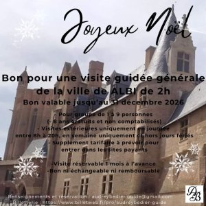 2025-11-17 00:00:00 2026-01-31 00:00:00 Europe/Paris BON CADEAU NOEL - VISITE ALBI 2H Reservations on : https://www.billetweb.fr/bon-cadeau-noel-visite-albi-2h-2025 -- JOYEUX NOEL !  VOICI UN BON CADEAU POUR :  UNE VISITE GUIDEE GENERALE DE LA VILLE DE ALBI (TARN) d'une durée de 2H. Accompagnée de Audrey, Guide-Conférencière, partez à la découverte de la ville et de ses anecdotes. Parcours indicatif : Nous verrons ensemble les jardins du palais de la Berbie et suivant la date et l'heure, l'intérieur de la nef de la cathédrale (pour les groupes de moins de 10 personnes - partie gratuite uniquement) puis une partie du centre ville classé au patrimoine mondial de l'humanité avec le cloître St Salvy et l'extérieur de la maison du vieil Alby. Attention, l'accessibilité aux sites de culte dépend des cérémonies et de la liturgie. La guide ne pourra être tenue responsable de l’impossibilité d’accès à certains sites pour cause de travaux ou autre, cette information étant donnée à titre indicatif en novembre 2025. ------------------------------------------------------- Toutes les visites sont des visites sèches, (elles ne comprennent pas la billetterie d'acc… Albi, France Audrey BEDIER EI