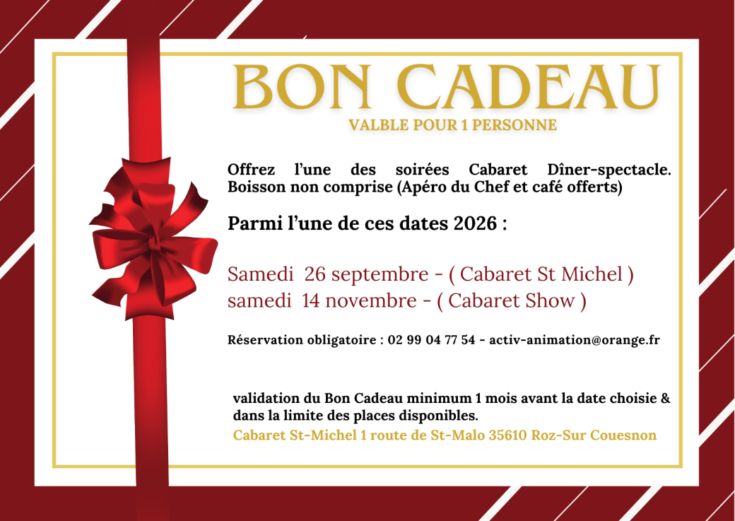 Bon Cadeau de 59€ par personne pour l’une des soirées Cabaret Dîner-spectacle. Boisson non comprise (Apéro du Cabaret et café offerts) Parmi l’une des dates :